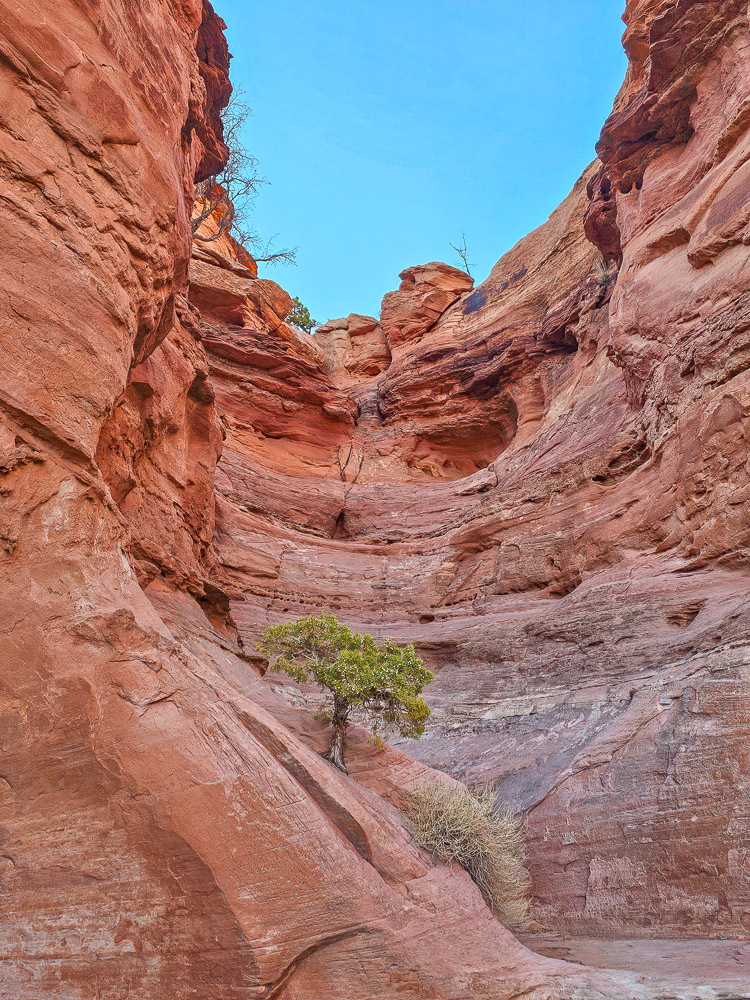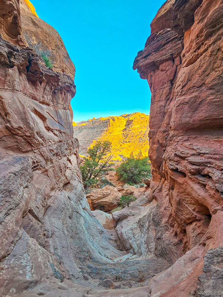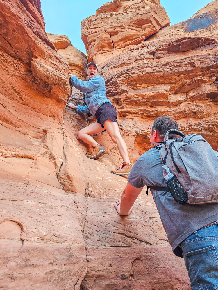 The hike itself is short, but it’s definitely an adventure. Much of the route involves scrambling up grippy sandstone and winding through narrow rock passages. In total, we counted about seven scrambling sections of varying difficulty before reaching the arch.