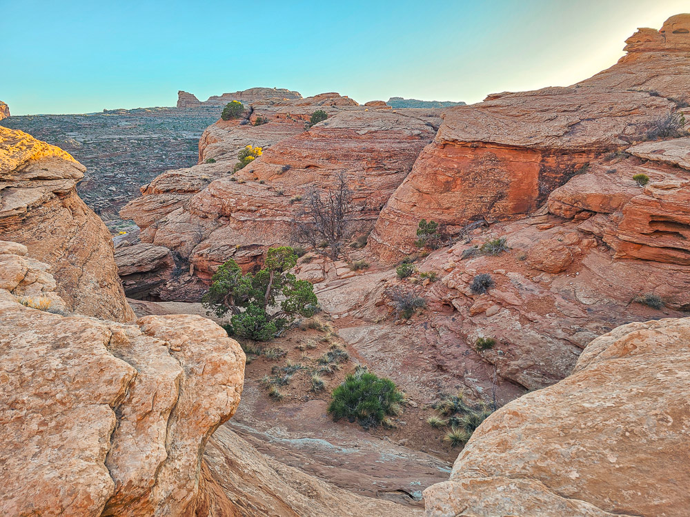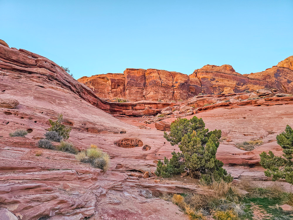 Once you get past that second scramble, the rest of the hike is much more straightforward. You’ll do some lighter scrambling through small canyons, climb up rounded sandstone hills, and wander through a rolling slickrock landscape full of interesting textures and formations. It’s just a really fun stretch of hiking.