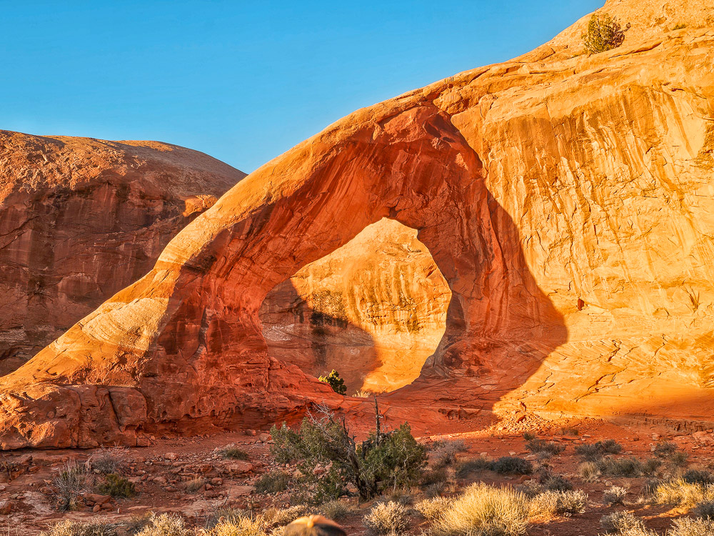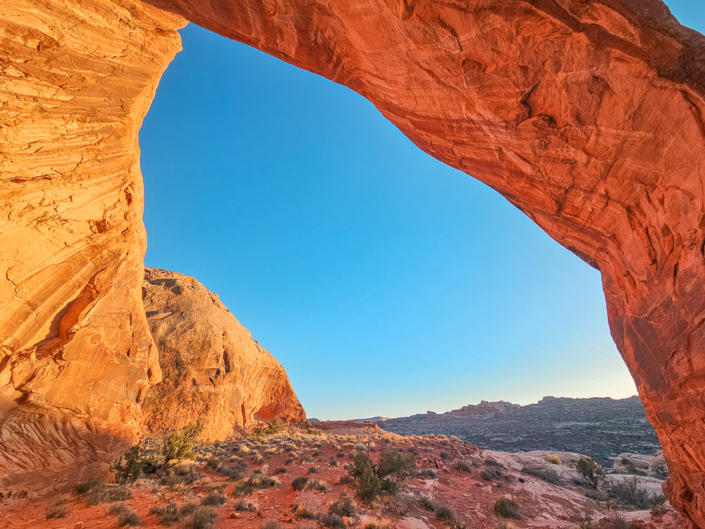 We were here right before sunset, and the arch was beautifully lit in the warm evening light. As long as you leave before the sun actually sets, you’ll still have plenty of light to get back. That said, we definitely wouldn’t want to climb down that second scramble in the dark.