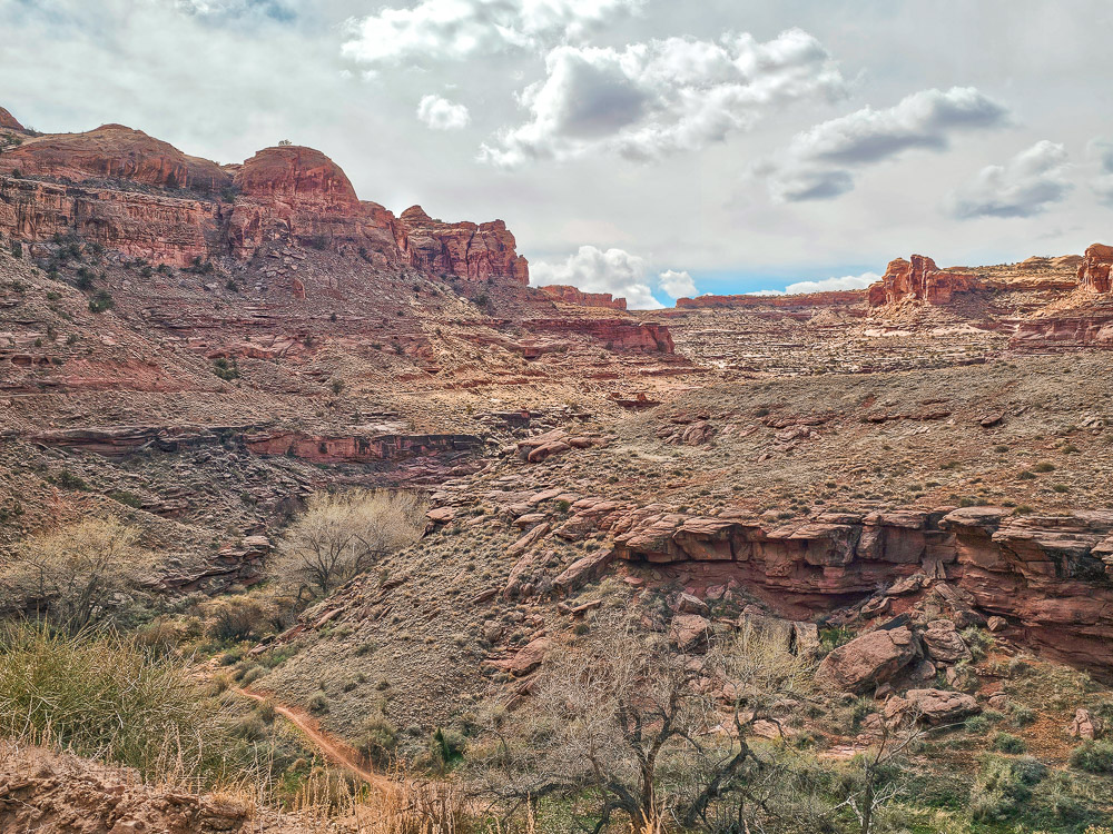 Funnel Arch is located on Kane Springs Road, about 15–20 minutes southwest of Moab. The drive to get here is beautiful. The road first follows the Colorado River before turning into the narrower and more rugged Kane Creek Canyon.