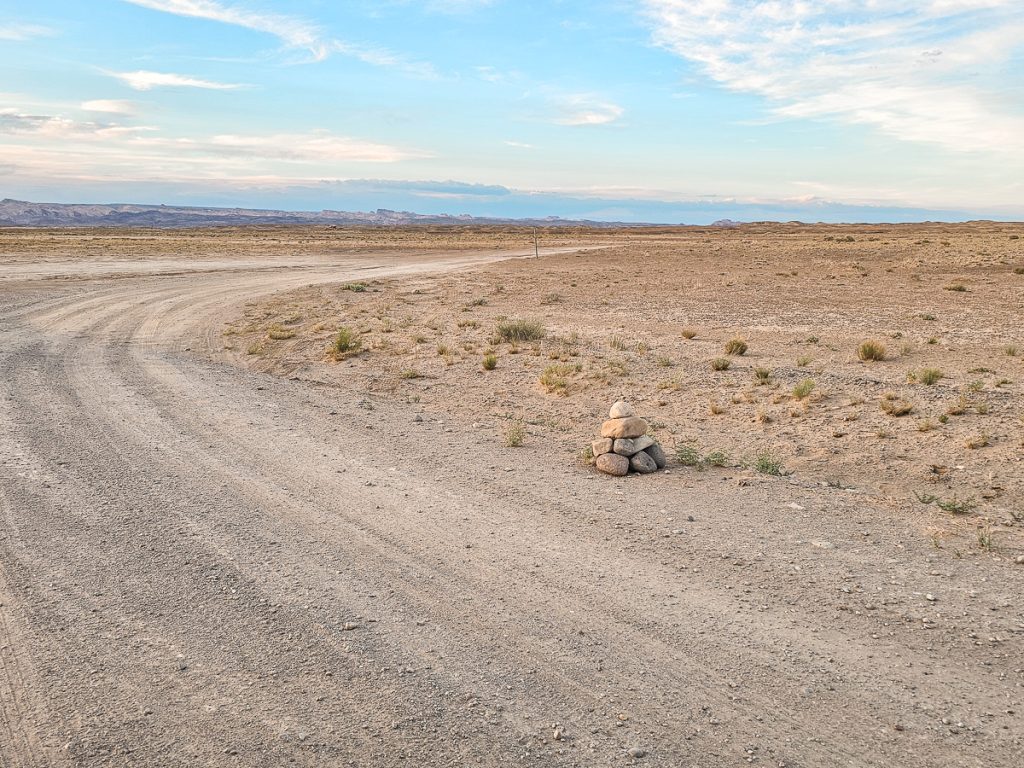 Whether you’re coming from the west or east, you’ll almost certainly be coming in via Highway 24. From the highway, you’ll turn onto North Factory Butte Road and follow it north to Factory Butte, a massive, isolated rock formation that rises straight out of the flat desert, with deeply ridged slopes and sharp vertical lines running down from the top. You’ll drive right towards and then past it – it’s impossible to miss and a really beautiful monolith.