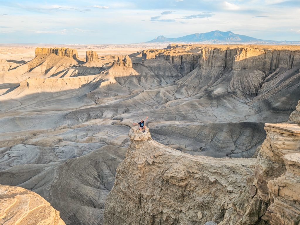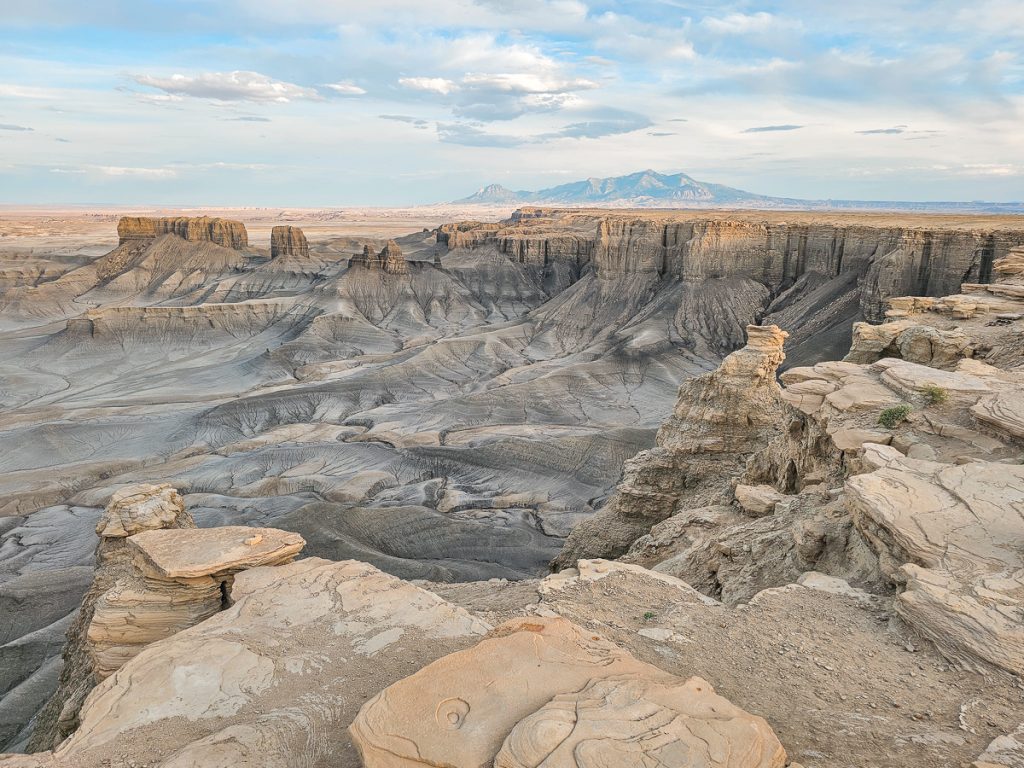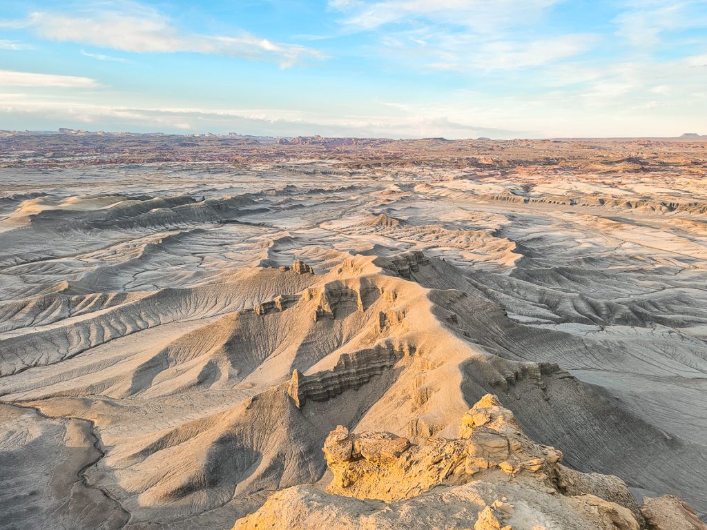 You’re standing on the edge of a stark cliff where the land drops off quickly below you. The flat-top rim curves around the basin below, giving you wide, open views across the landscape. Below, soft, eroded hills ripple out in every direction. The terrain is mostly gray and tan, with thin lines, ridges, and grooves carved across the surface.